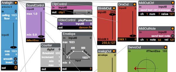 This free collection of software makes it easy integrate all kinds of media with microcontrollers like the Arduino. Using a simple drag-and-drop interface, you can create interactive projects that combine sensors, video, text, graphics, sound, lighting, motors and more. These projects can be created quickly, without programming, using the smart widgets included with the Toolkit.